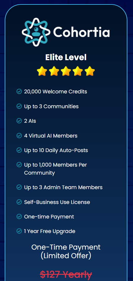 At $47 one-time, Cohortia is a rare opportunity to own a powerful AI-driven community platform at an entry-level price. If you’ve been thinking about building a community but hesitated because of cost or effort, this early-bird deal makes now the smartest time to get started.