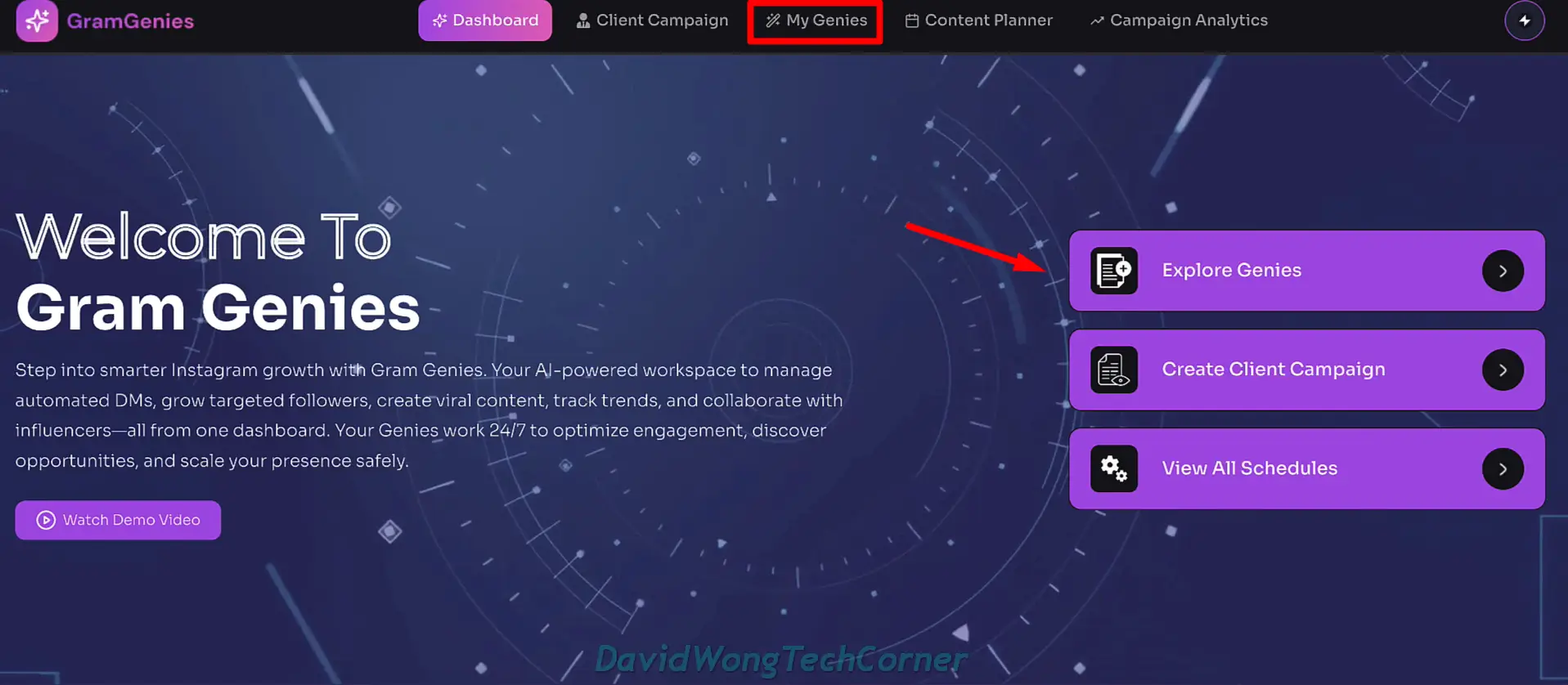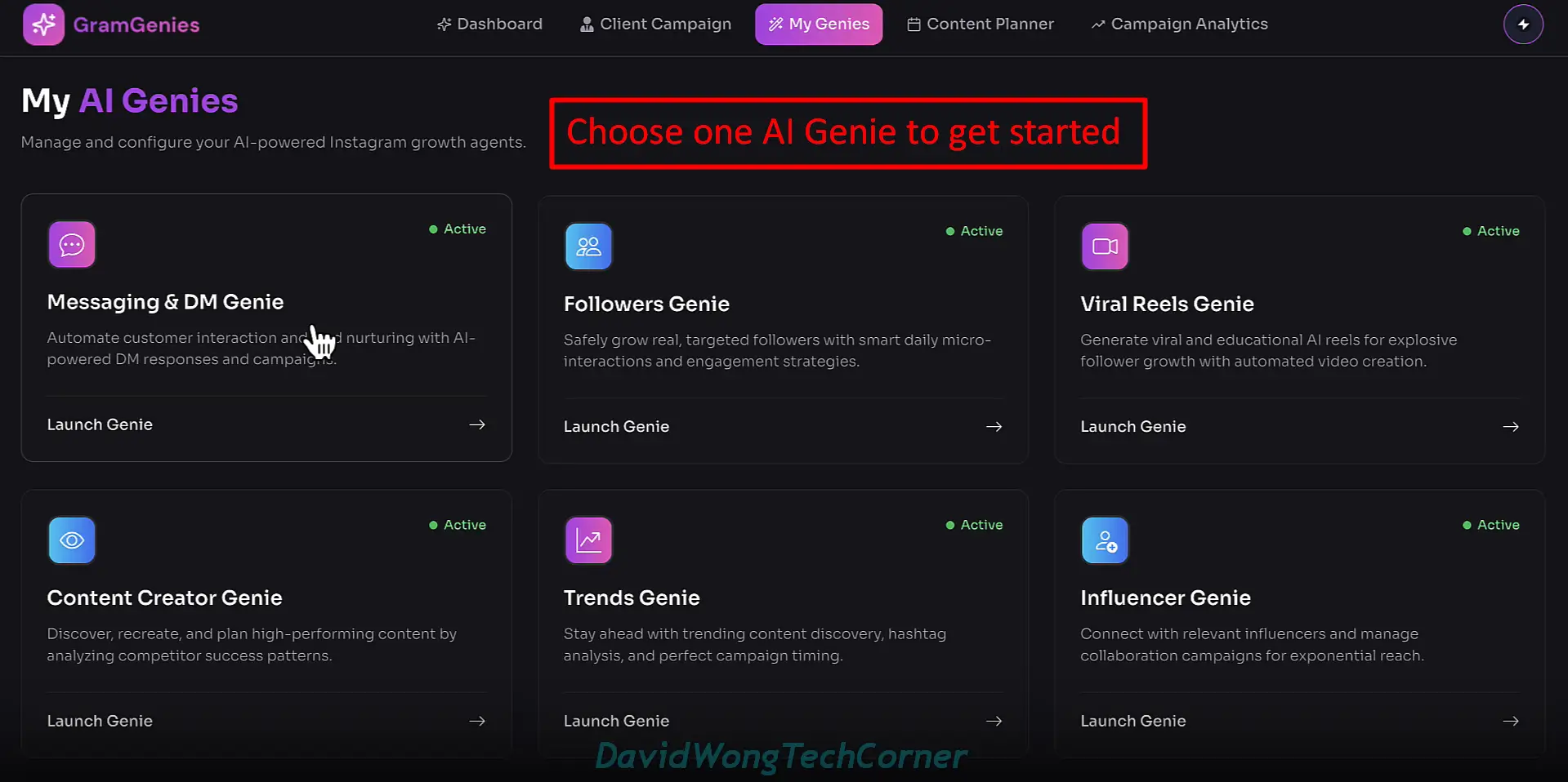 Inside the “My Genies” section, you’ll see six different AI-driven Instagram growth agents designed to handle specific tasks: