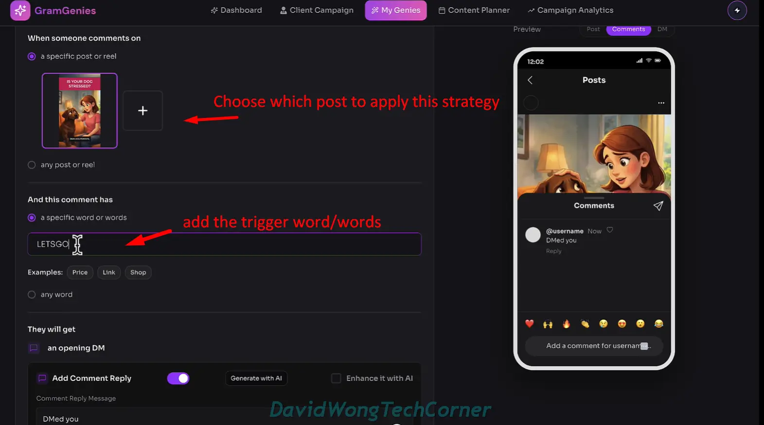 Next, decide where the automation should run and which comment will activate it. You can assign it to a specific post or reel, so it only applies to that piece of content. Then define the trigger word or phrase, ensuring only users who comment on that exact keyword enter the automation flow. This keeps everything precise and avoids accidental triggers from unrelated comments: