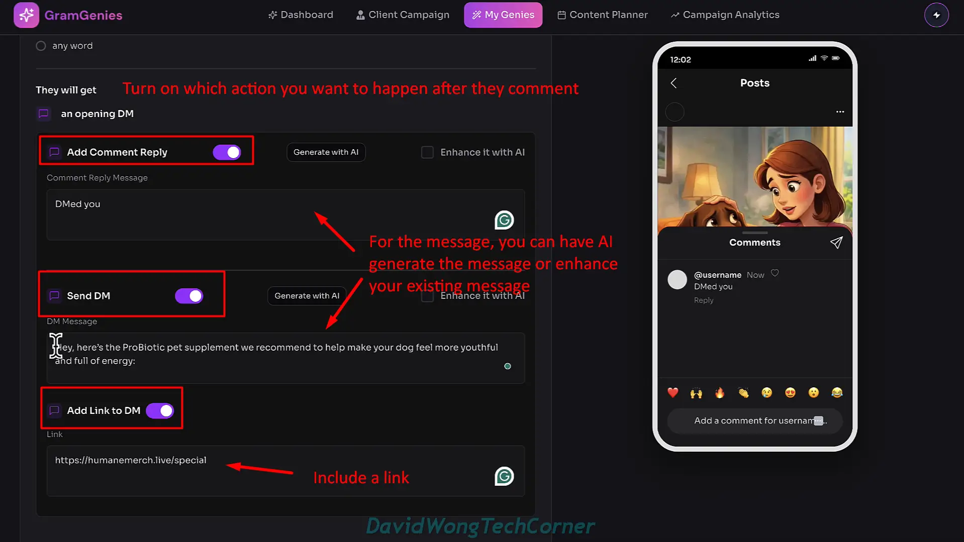 You can set trigger words so when someone comments asking for a link or information, the Genie automatically sends the correct link in their DMs. That is huge because it captures intent the moment it happens, instead of you replying hours later when the person already scrolled away.