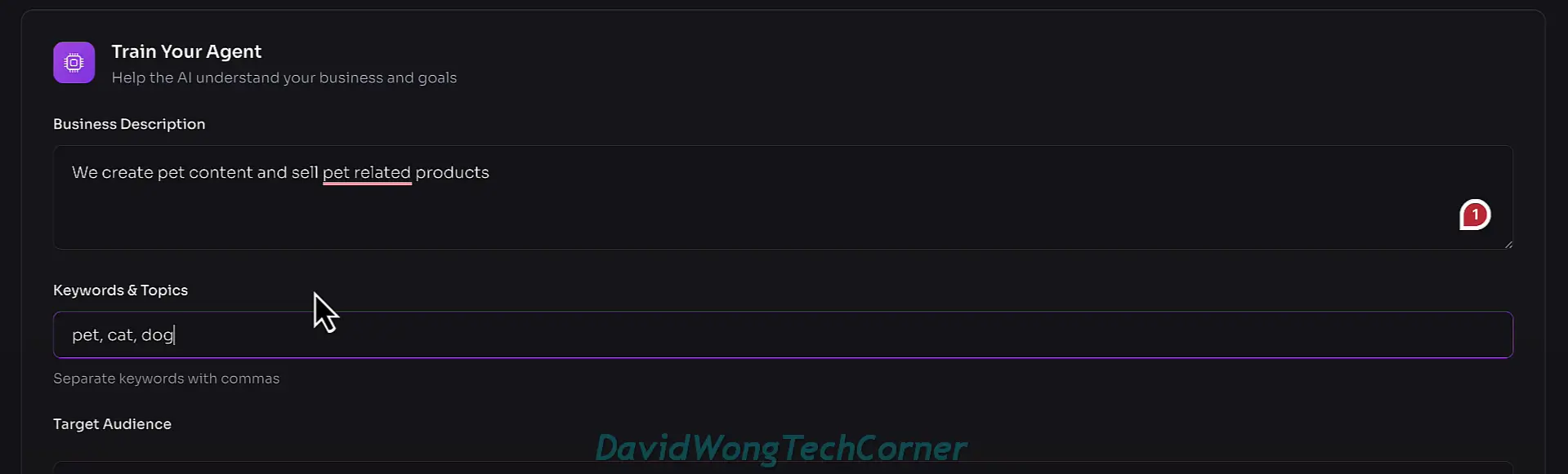 Then train your AI agent by entering the business description and relevant topic keywords. This gives the system a clear understanding of your brand and audience: