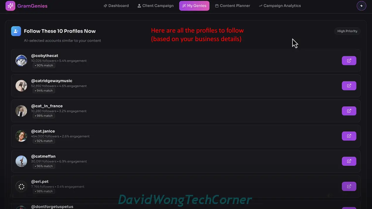 Based on the information you provided, the system generates a list of suggested profiles to follow. You’ll see helpful insights like follower count, engagement rate, and a compatibility score. Simply open each recommended profile and follow them to attract the right audience more strategically and safely: