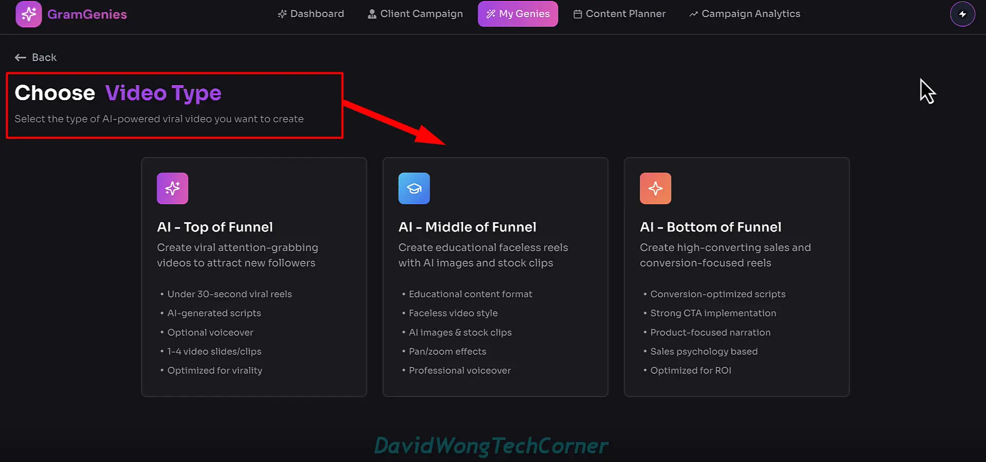The Viral Reels Genie helps you create the right type of videos based on your current follower stage. That means you can make top of funnel reels to grab attention and reach new people, middle of funnel reels to build trust with educational content, and bottom of funnel reels that introduce your offer and drive action.
