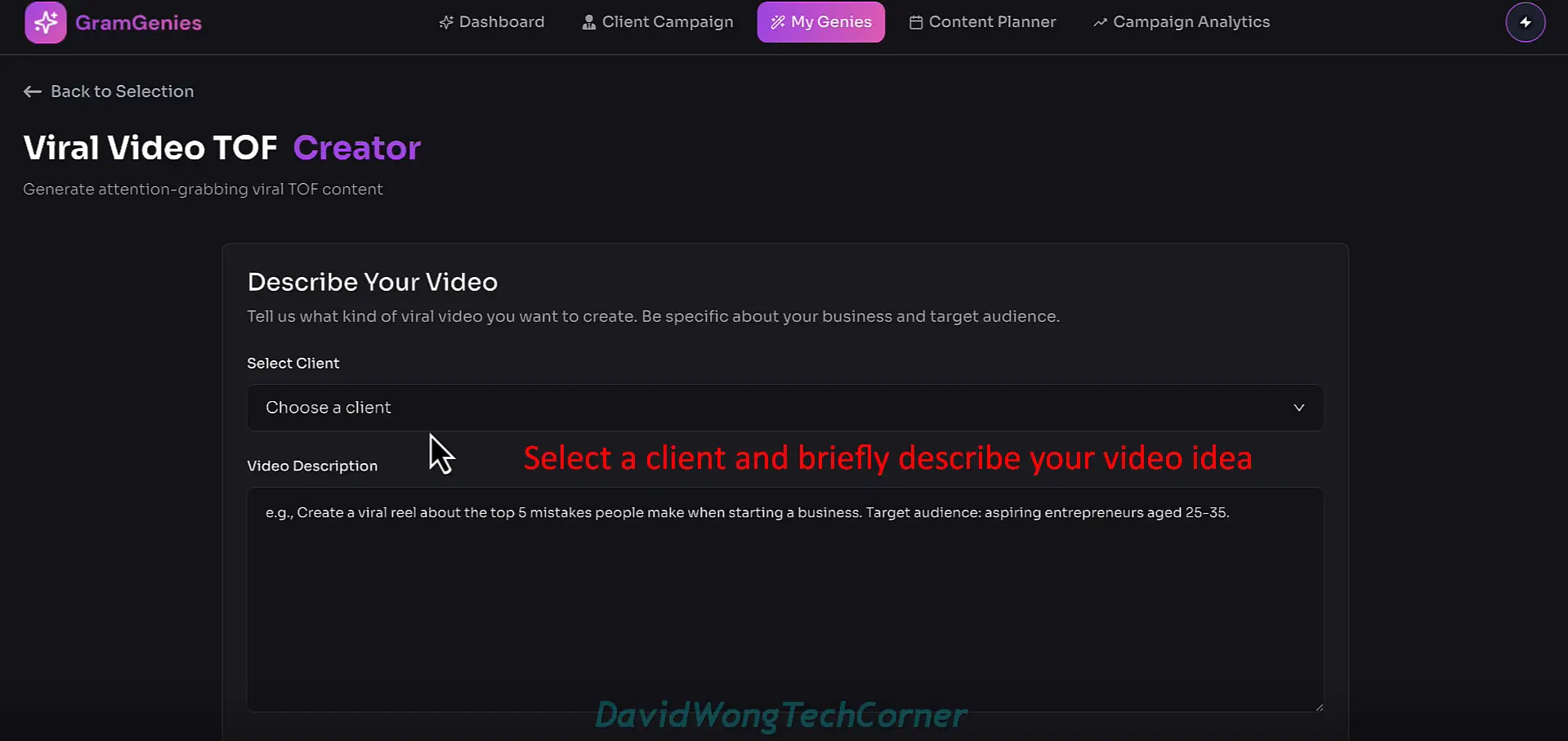 Select your client or brand, name the content piece, and enter either a simple keyword or a detailed prompt. This guides GramGenies on what to write while keeping the content optimized for the platform’s ideal length: