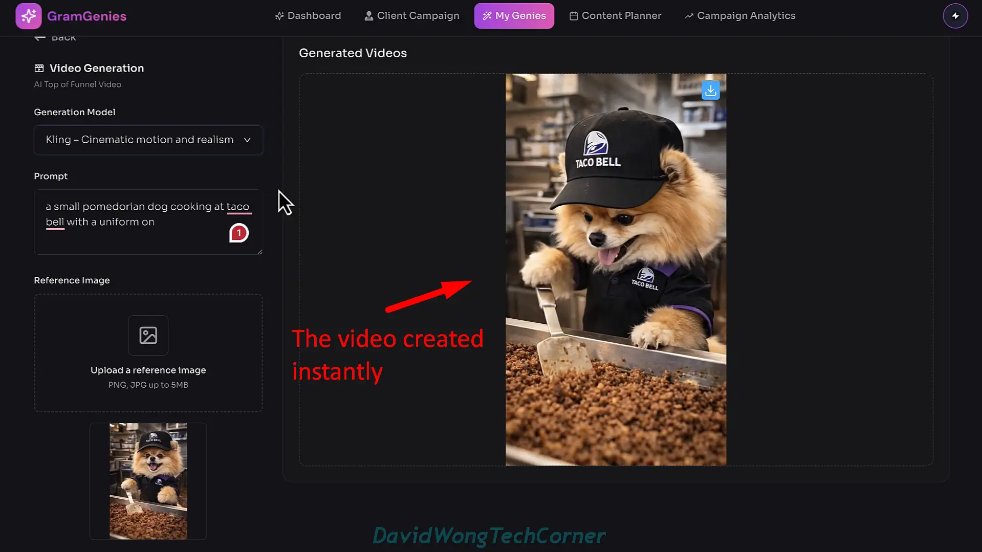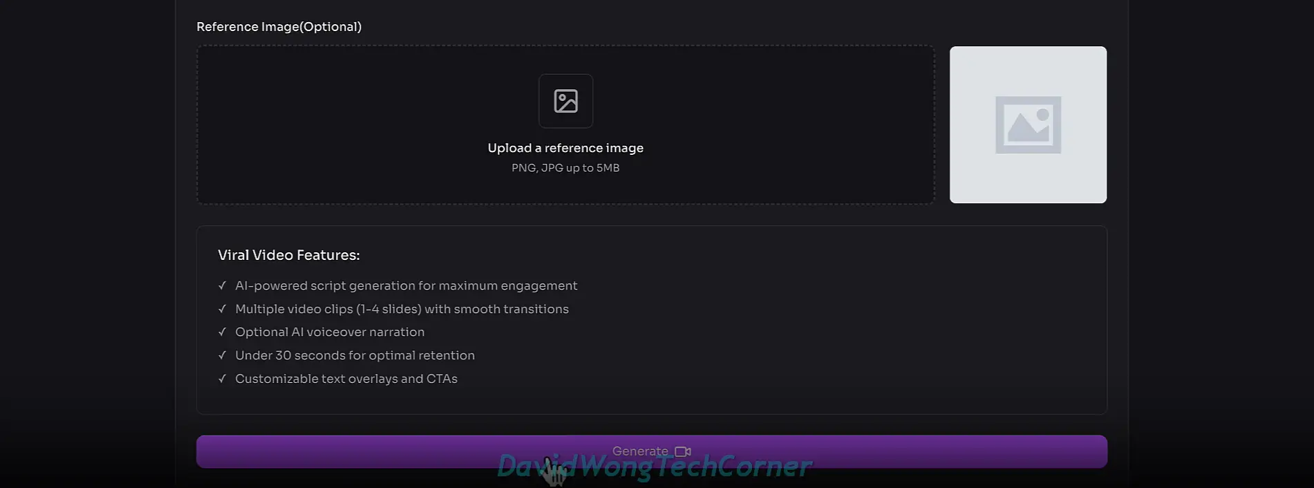 To create a high-impact top-of-funnel video, describe your idea, upload a reference image if desired, and click “Generate”: