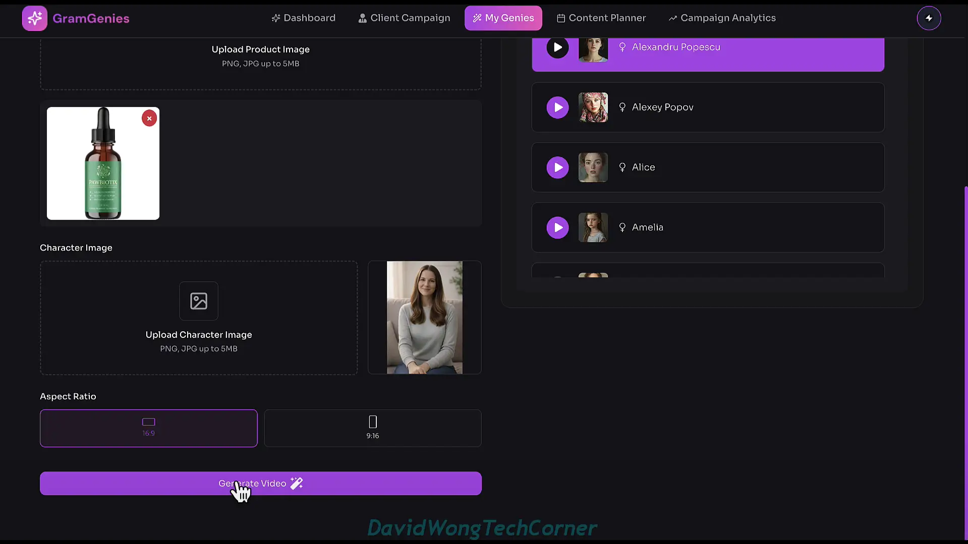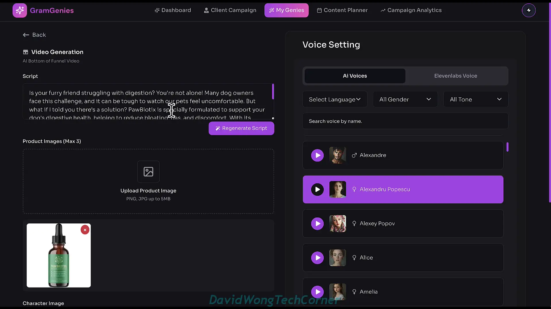 For bottom-of-funnel videos, combine your script with product visuals and select a voiceover for narration. Upload product and character images, review or regenerate the script if needed, then choose an AI voice filtered by language, gender, and tone. This allows you to produce a polished, sales-focused reel without recording yourself: