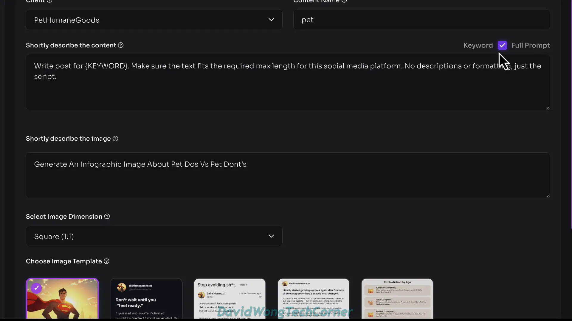 Yes. You can generate the caption and the AI image in one workflow, choose image dimensions, and pick different template styles like regular posts or infographic formats.