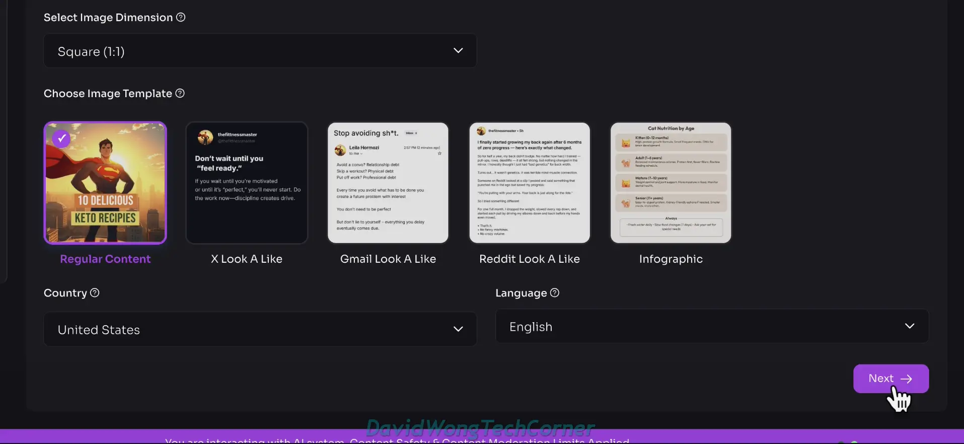 Next, describe the image you want, choose the size format, such as square 1:1, and select a design template. You can switch between multiple post styles, including standard posts, X-style, Gmail-style, Reddit-style, or infographic formats: