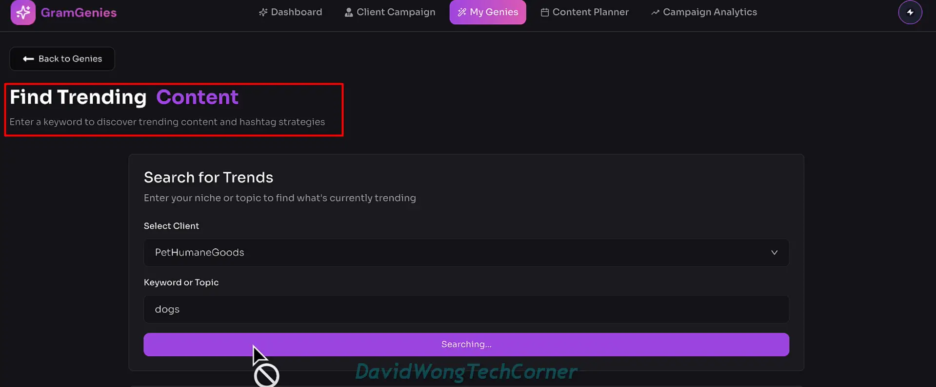 Use the Find Trending Content feature to discover proven ideas within your niche. Select the client, enter a keyword or topic, and launch the search.
