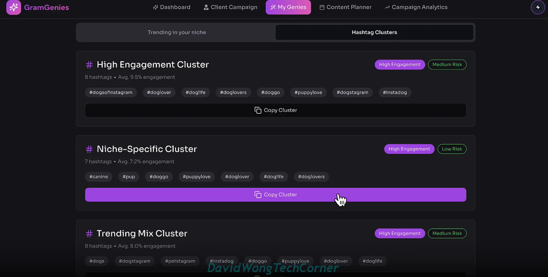 Yes. It can generate hashtag clusters with labels like engagement and risk levels, and you can copy full clusters quickly for your posts.