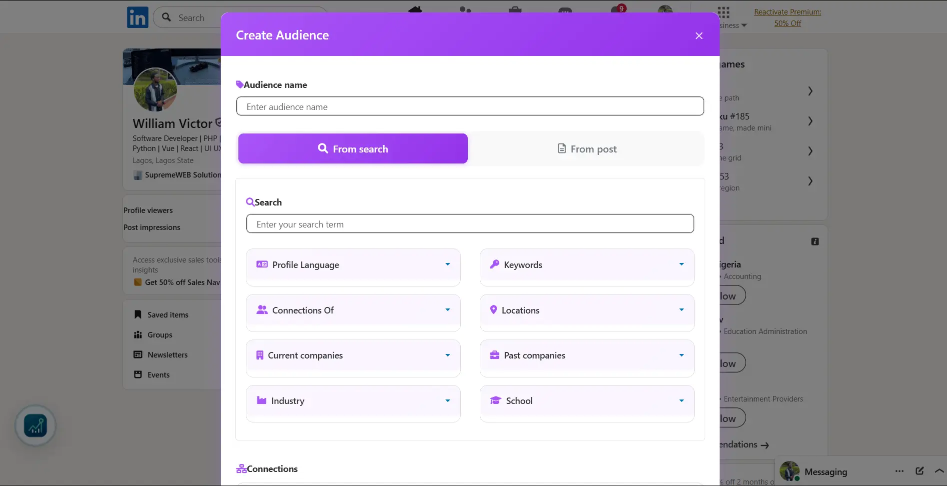 You can quickly build a list of people to contact directly from LinkedIn. Use smart search filters to narrow down your ideal audience, and tap into competitor audiences to find people who already follow or engage with similar services.