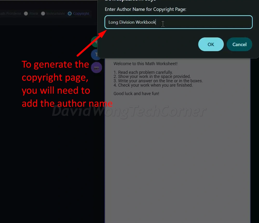 To create a copyright page, simply enter your author name. The system will generate a complete copyright section automatically: