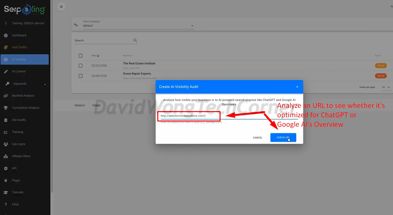 To get started, head over to the AI Visibility area and launch a new audit. Paste in the website URL you want to check, then click Check URL so SerpSling AI can begin reviewing how well that site is set up for AI search platforms such as ChatGPT and Google AI Overviews: