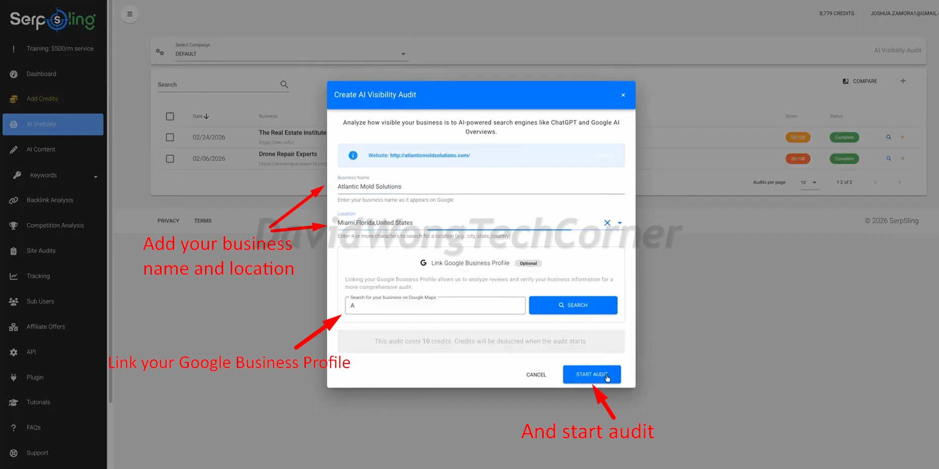 After that, fill in the business name and location to give the software more accurate context for the audit. You can also connect the Google Business Profile at this stage, then click Start Audit to run the full AI visibility scan: