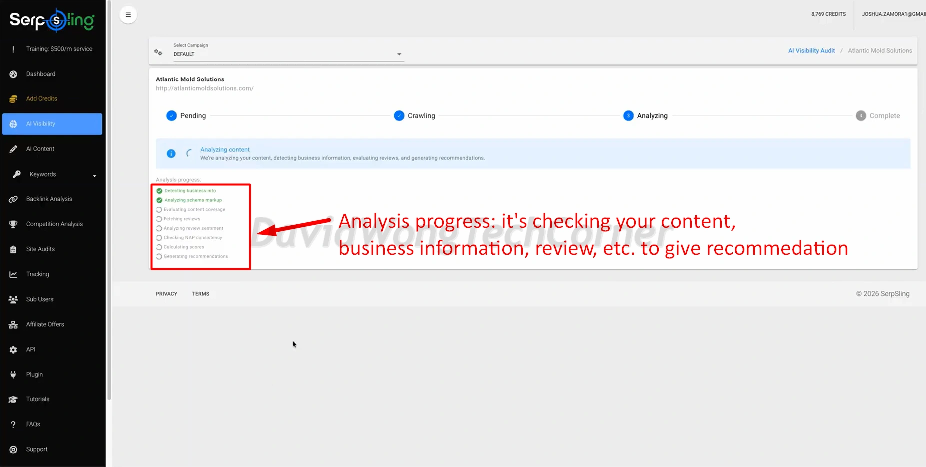 Once the audit begins, SerpSling AI starts scanning the website and related business data. It checks the site content, business details, reviews, and other key signals that can affect how a business appears in AI search results: