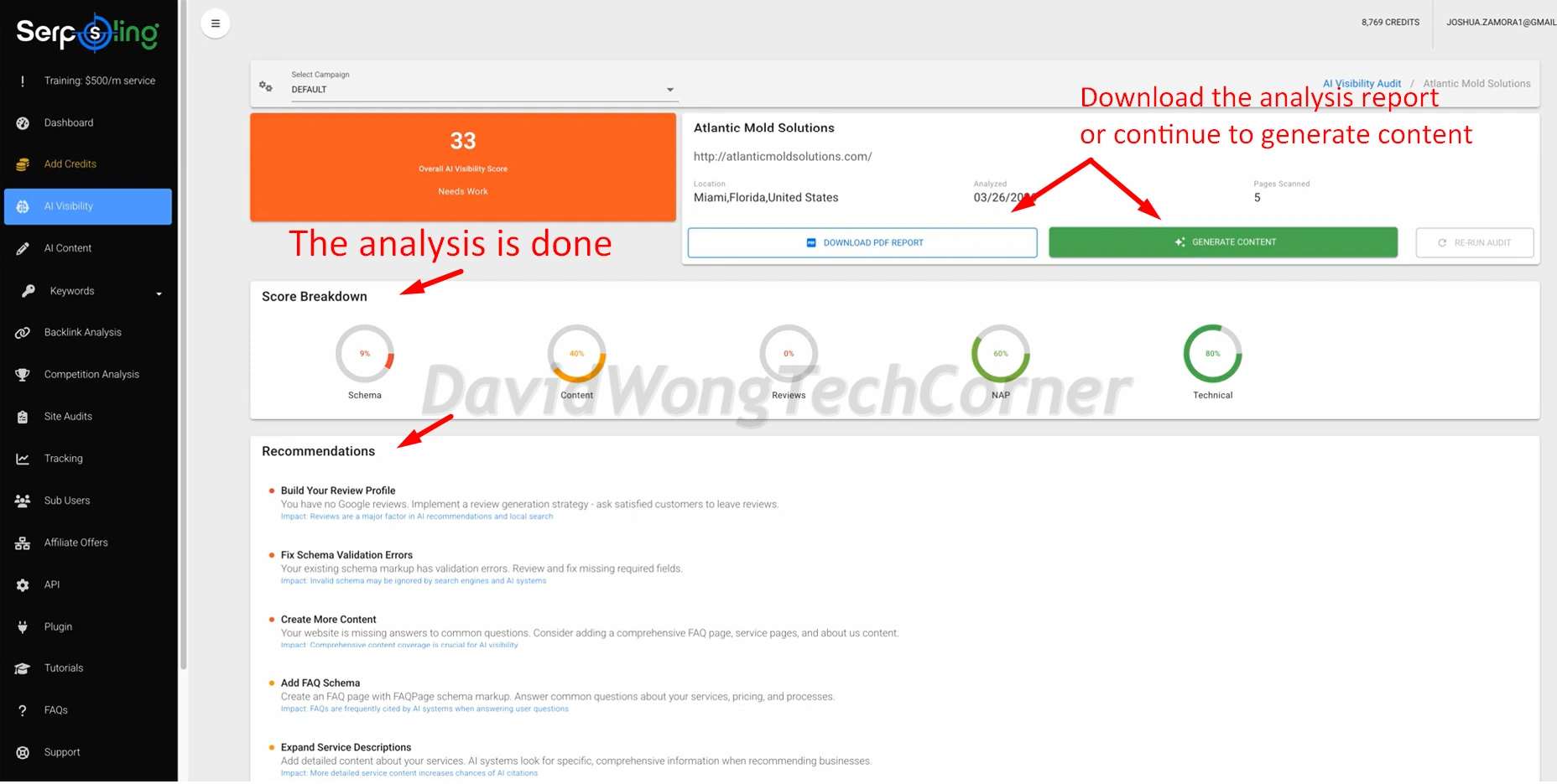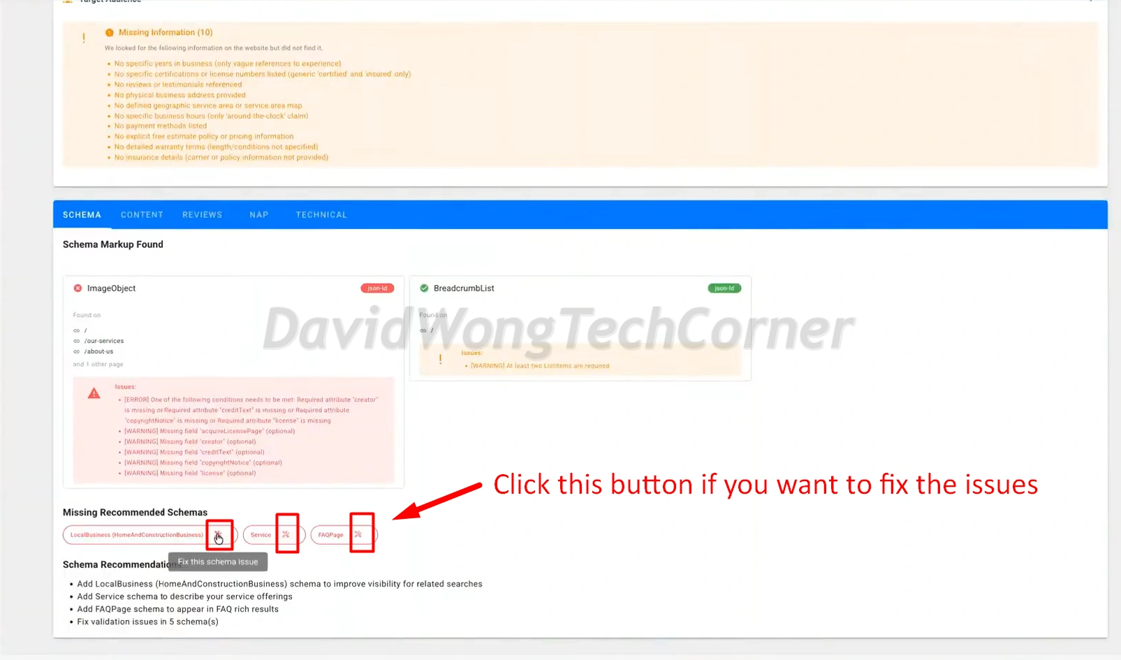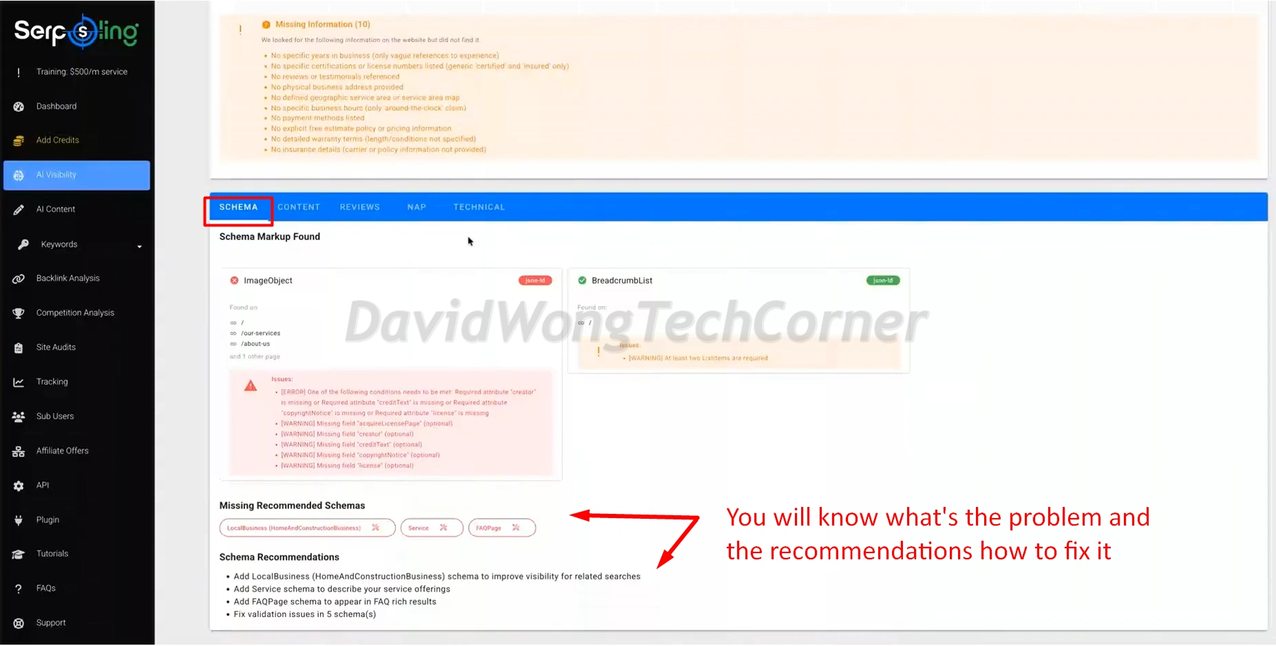 You can move through tabs such as Schema, Content, Reviews, NAP, and Technical to inspect each section more closely. Each tab shows what the software found and what should be improved to make the site more AI-search-friendly.