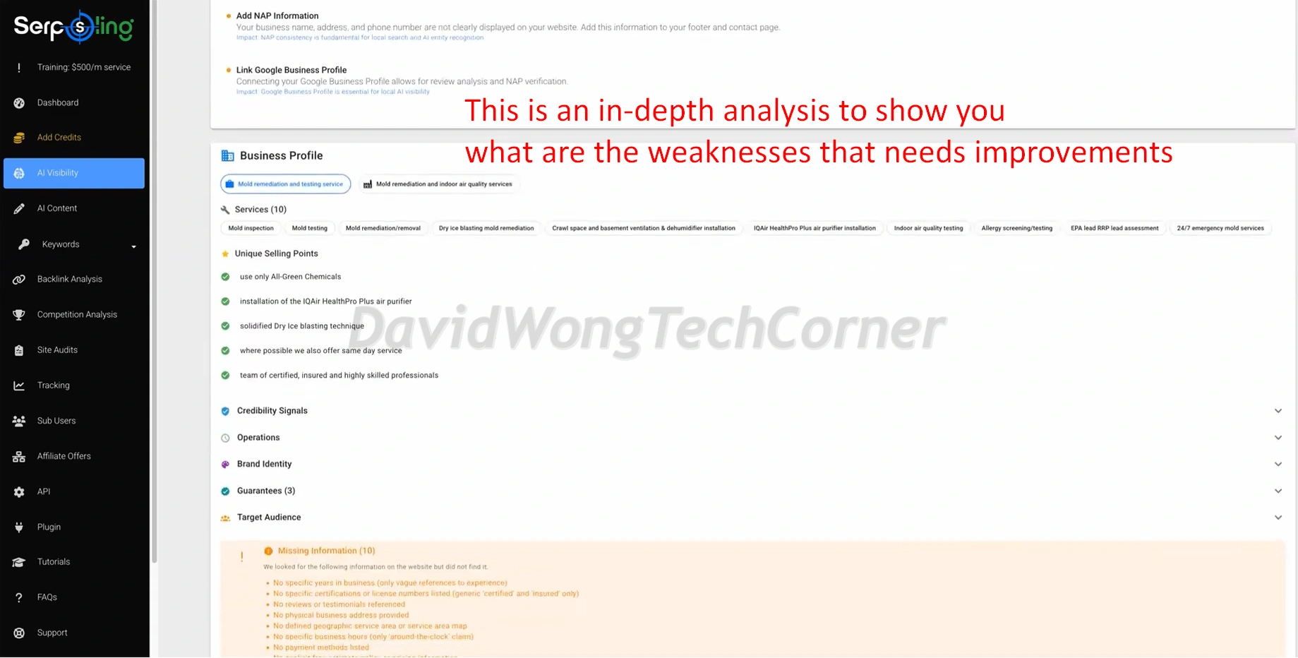 As you scroll lower, SerpSling AI gives you a more detailed look at the weak points. This makes it easier to spot the areas that may be limiting the business from getting stronger visibility in AI-driven search: