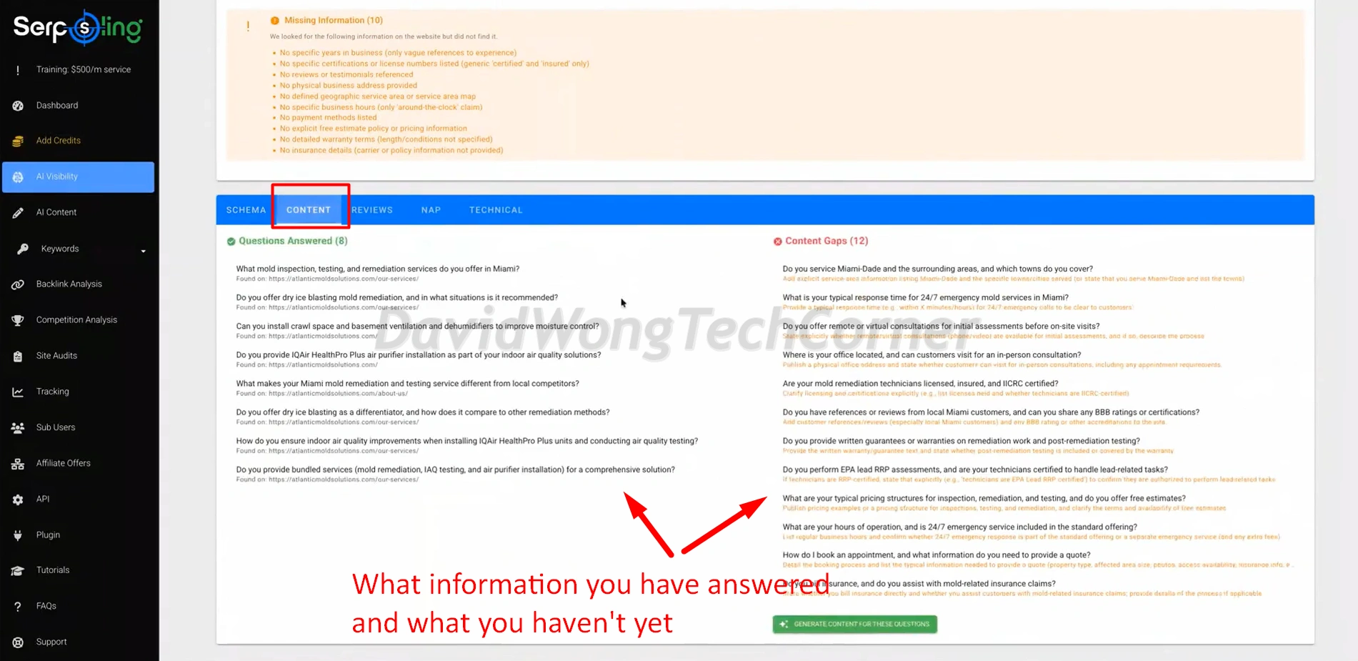 Inside the Content tab, SerpSling AI reveals which questions the website is already covering and which useful questions are still missing. That gives you a clearer idea of where the site needs stronger content to become more complete for AI search engines:
