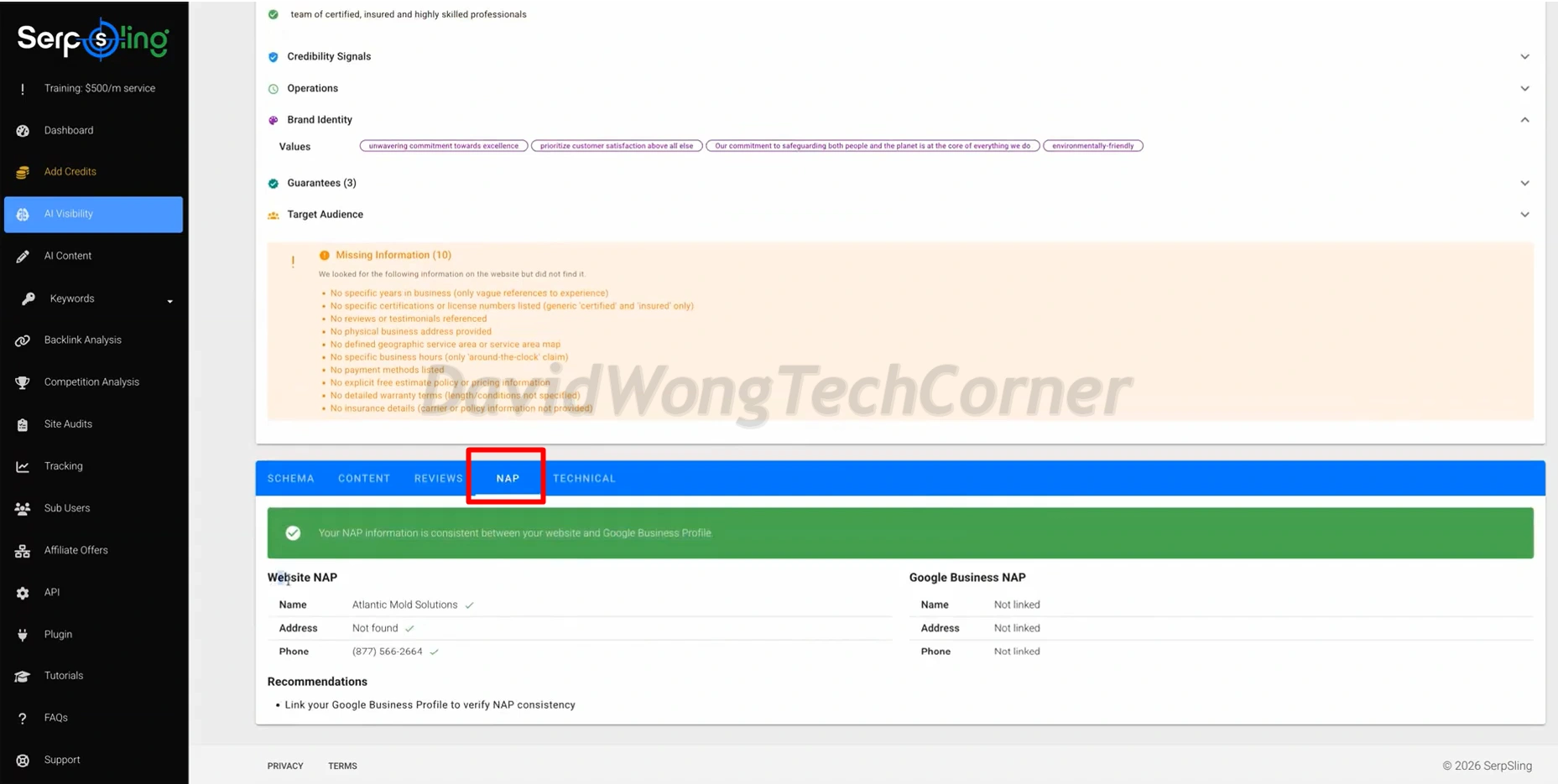 In the NAP tab, you can review the business name, address, and phone number shown on the website and compare that data with the linked Google Business Profile. This is useful for spotting mismatched details that could weaken trust and hurt AI visibility: