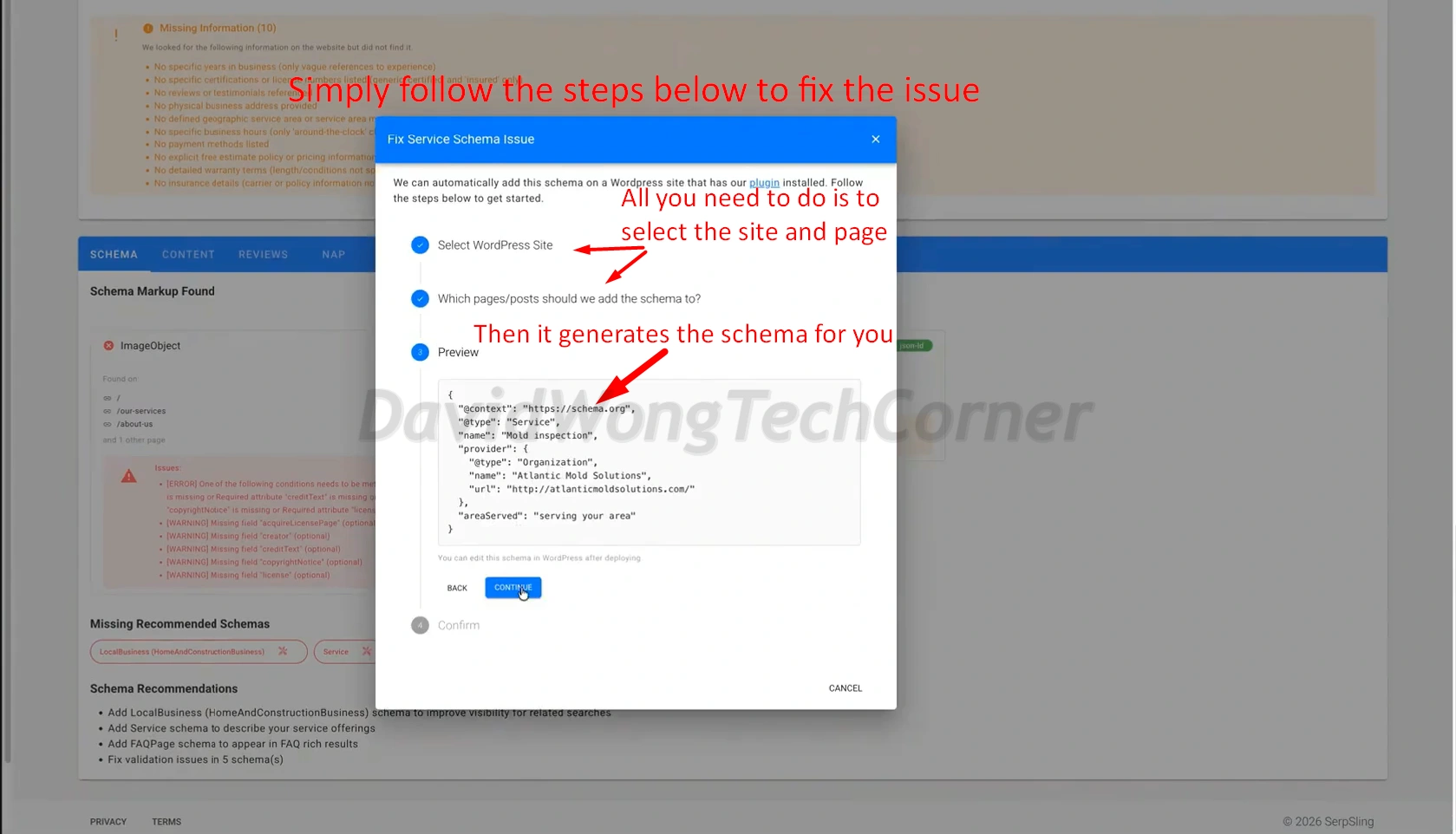 After you click to fix it, a setup window will appear. Choose the connected WordPress site, select the page or post where the schema should go, preview the generated schema, and continue so the platform can prepare it for publishing: