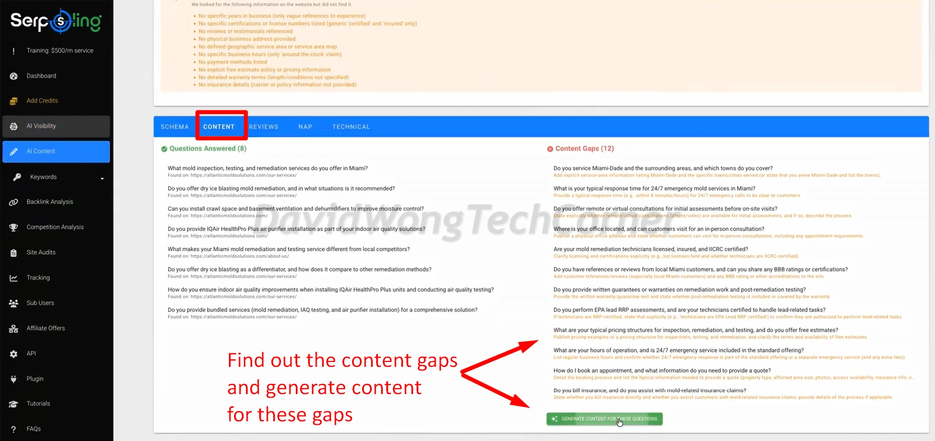 Next, open the Content tab and review the unanswered questions and content gaps. Then click Generate Content For These Questions so the software can build content based on the missing information uncovered during the audit: