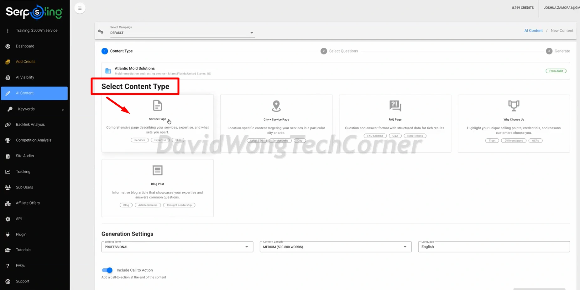 SerpSling AI will then ask you to choose the type of content you want to create. Pick the format that best fits the page you want to build, such as a service page, FAQ page, blog post, or another suitable content type: