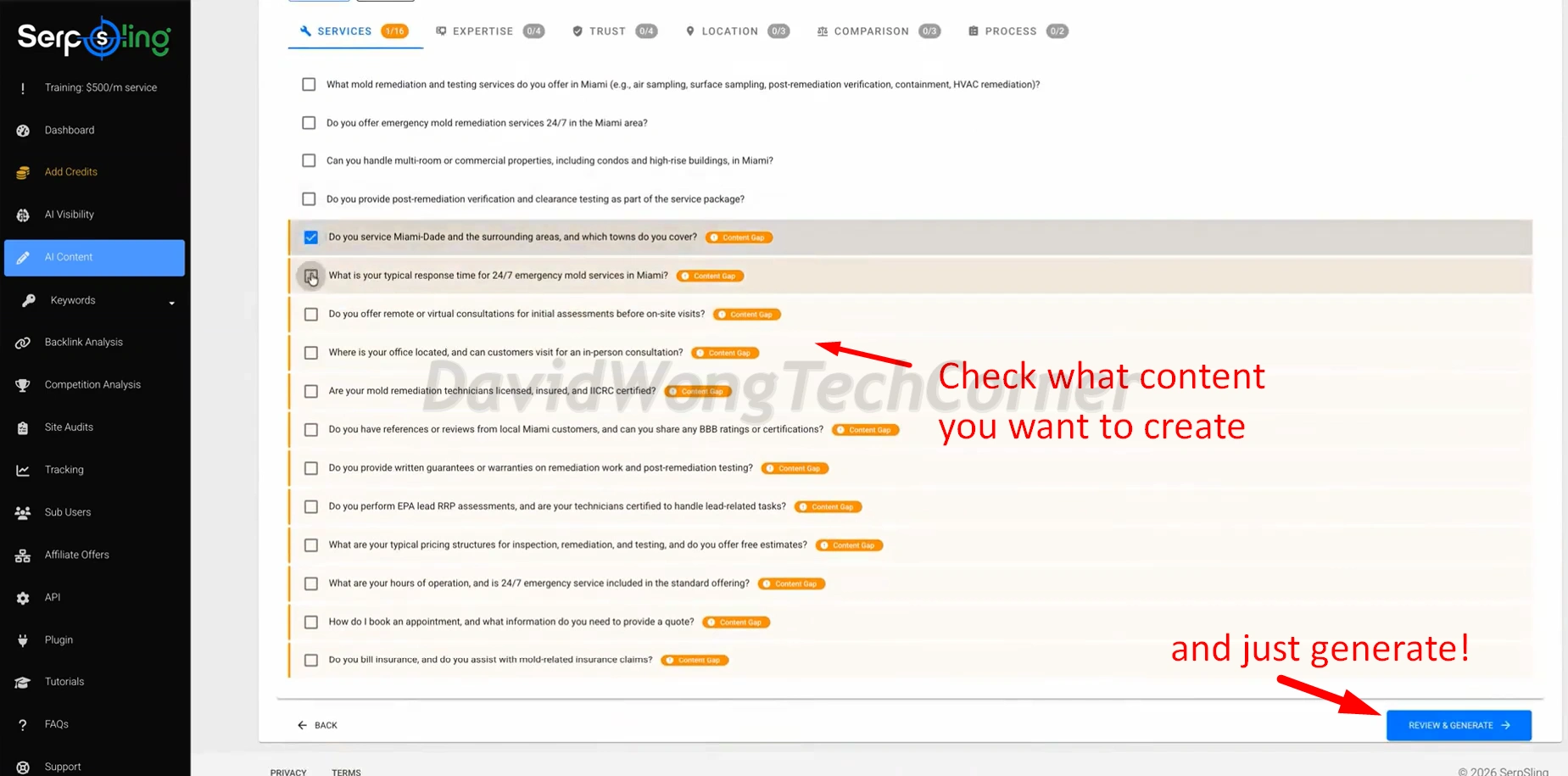 After choosing the content format, select the questions or content gaps you want the platform to cover. Once that is done, click Review & Generate to continue and let the software produce the draft: