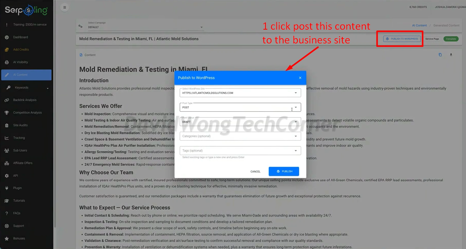 When the draft is ready, click Publish to WordPress. Then choose the destination site, set the page details and category options, and click Publish to push the content live directly from the dashboard: