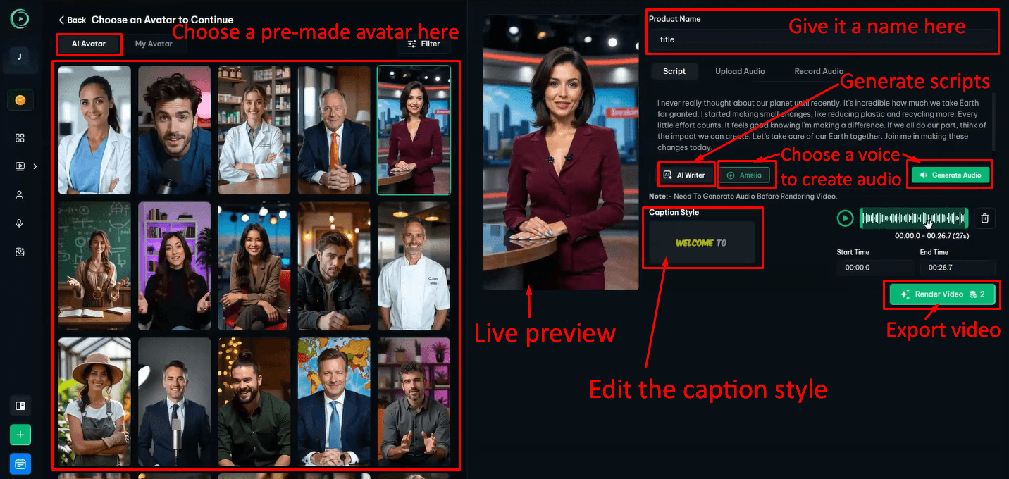 - An all-in-one platform that handles scripts, avatars, voiceovers, and video rendering.