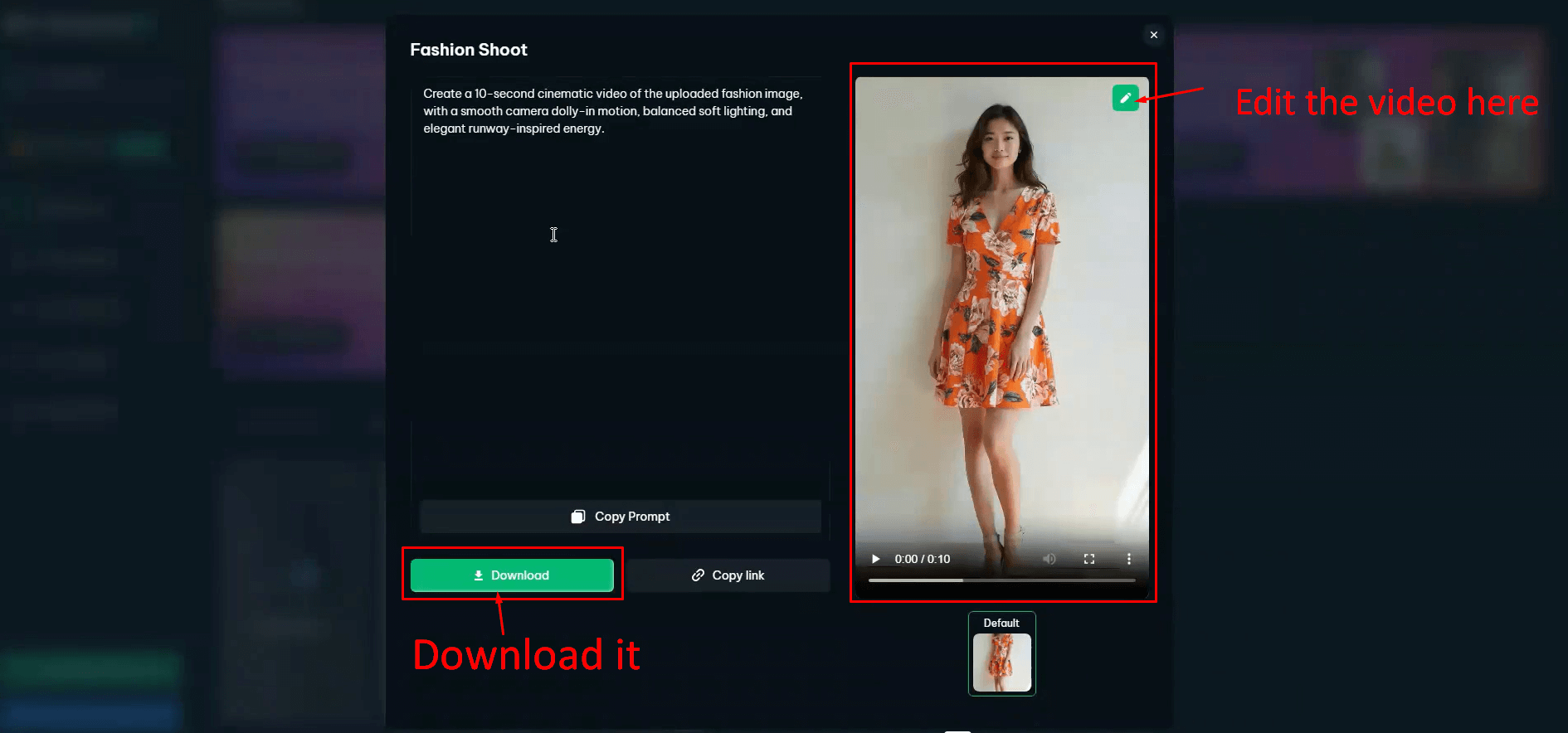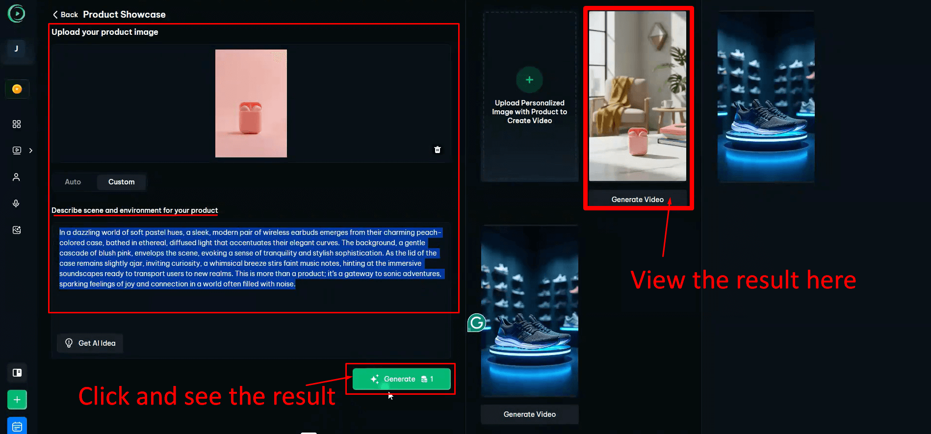 The platform automatically adds lighting depth, camera movement, and motion effects while keeping your product sharp and clear. You don’t need to direct scenes or adjust technical settings.