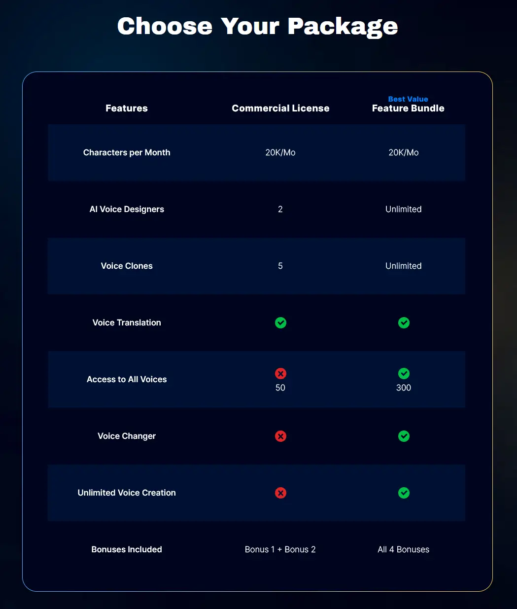 - One-Time Payment Advantage – Unlike subscription tools (e.g., ElevenLabs, Resemble), the Feature Bank upgrade allows you to lock in premium features at a fixed, one-time price, rather than incurring ongoing monthly costs.